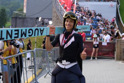 Aber natürlich war das wichtigste am Wochenende der Wettkampf von der großen K 120 Schanze. Insgesamt waren 69 Männer und 38 Frauen am Start. Und mittendrinn zwei Bad Freienwalder Athleten. Die 20jährige Alvine Holz schaffte sowohl am Sonnabend als auch am Sonntag mit jeweils Platz 21 wieder ein Super-Ergebnis. In der Grand Prix Wertung liegt sie damit derzeit auf dem 22. Rang unter den 40 besten Skispringerinnen der Welt. Max Unglaube in seiner ersten großen internationalen Saison sprang am Sonnabend mit Rang 51 sehr knapp an der ersten Qualifikation für den eigentlichen Wettkampf vorbei. Am Sonntag wurde es dann der 49. Platz, was zugleich die Qualifikation bedeutete. Von den 68 Startern hatte er immerhin 19 hinter sich gelassen. Im ersten Wertungsdurchgang konnte er sich noch einmal verbessern und beendete diesen auf dem 34. Rang. Herzlichen Glückwunsch an die Beiden! |