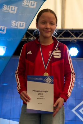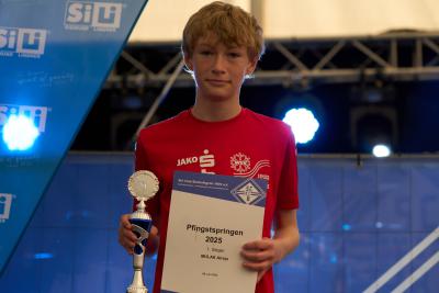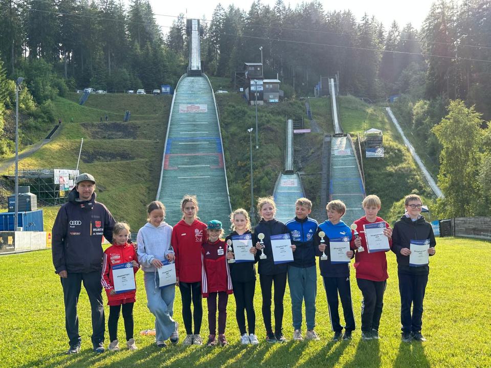 Pfingsten gibt es auf den Ochenkopfschanzen in Bischofsgrün traditionell das Pfingstspringen, und seit Jahren immer mit dabei sind die Skispringerinnen und Skispringer des WSV 1923 aus Bad Freienwalde. Bei zugegebenermaßen teilweise miserablen Wetterverhältnissen trotzen sie diesen und machten auch beim Jahrgang 2025 wieder eine gute Figur. Leon Latypov, Atreju Mulak und Karla Anklam durften dann auch das Siegerpodest bis ganz nach oben besteigen. Mit Rang 2 nur eine Stufe tiefer konnte auch Lousia Biesecke einen Platz auf dem Siegerpodest einnehmen, ebenso wie Pauline Linke mit dem dritten Rang. Mit Rang 4 für Nina Rolke, Rang 5 für Simon Krug, Rang 9 für Bruno Quasdorf und Rang 10 für Maya Sucher sprangen vier weitere Bad Freienwalder Adler unter die ersten 10. Mit dem 13. Platz vervollständigte Anja Rost das insgesamt hervorragende Ergebnis. Dabei waren Anja und Bruno unzufrieden, hatten sie doch nicht die Chance einer Verbesserung im 2. Durchgang. Durch den Ausfall der Beregungsanlage wegen einer defekten Hauptsicherung wurde von der großen K 64 Schanze nur der 1. Durchgang gewertet. Und in ebendiesem war den Beiden leider nicht alles so gelungen, wie sie es sich gewünscht hätten. |