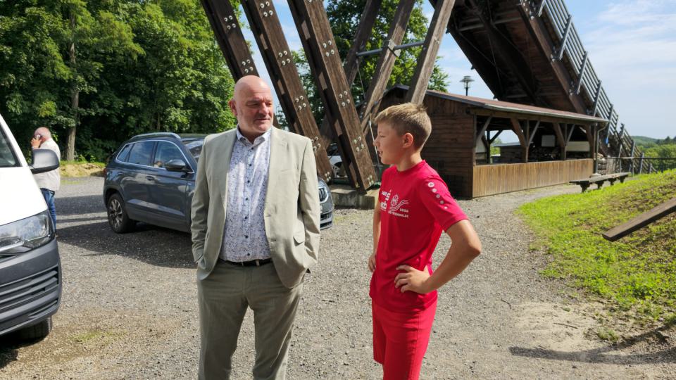 Zu einem sehr interessanten Erfahrungsaustausch weilte der brandenburgische Minister für Finanzen und Europa in der Sparkassen-Ski-Arena. Er zeigte sich offensichtlich sehr Sportinteressiert und konnte sich mit Bruno Quasdorf auch über das Skispringen und die notwendige Technik als Kenner der Materie unterhalten. Neben der Nachwuchsgewinnung für die brandenburger Skispringer kam als zweites Thema die "Tour de Tolérance" zur Sprache. Minister Crumbach konnte auch beim Thema Radfahren einige seiner Episoden zum Besten geben. |